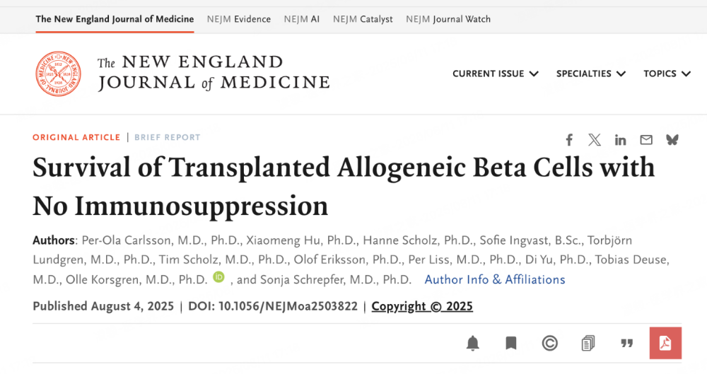 这项商议于8月4日发布在《新英格兰医学杂志》官网头条,在首例经受疗养的患者中,经“低免疫时期(HIP)”改造的胰岛细胞,隐没了东谈主体免疫系统检测,露馅出存活迹象,并合手续在患者体内产生胰岛素。